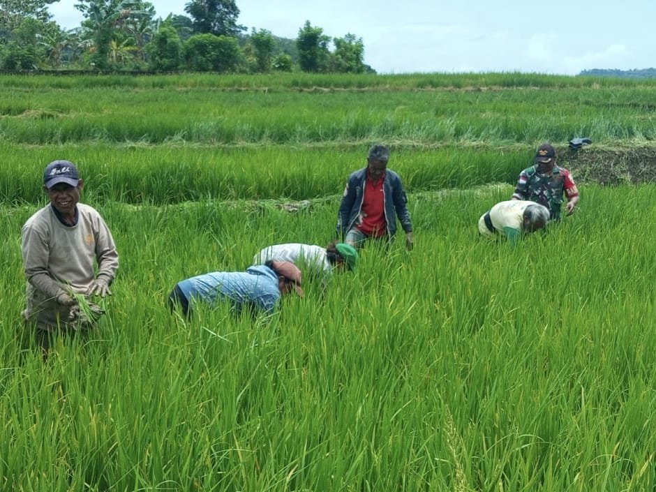 ACEH JAYA – Musim panen padi dimanfaatkan Babinsa Posramil Pasie Raya Kodim 0114/Aceh Jaya, Sertu Arapik, untuk turun langsung membantu