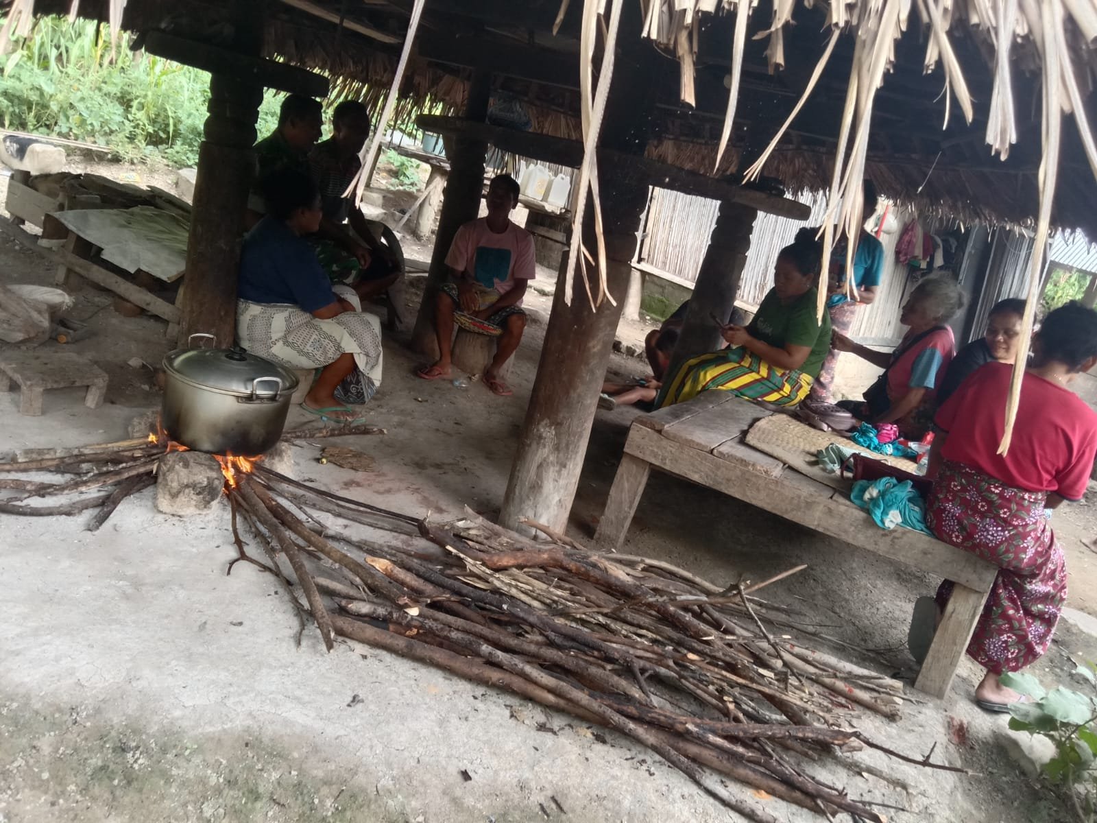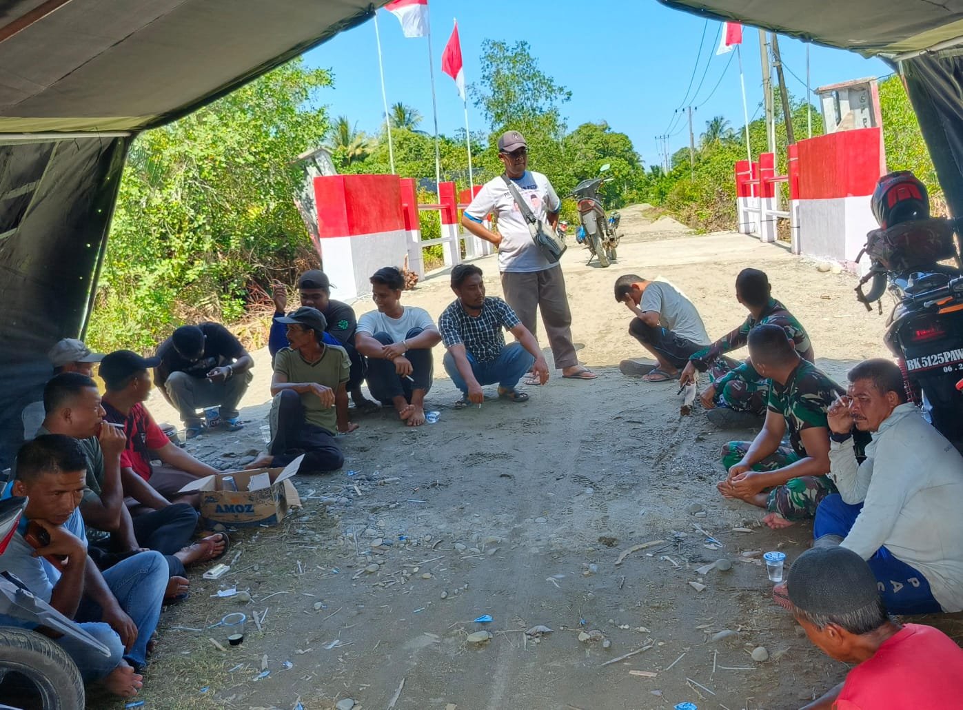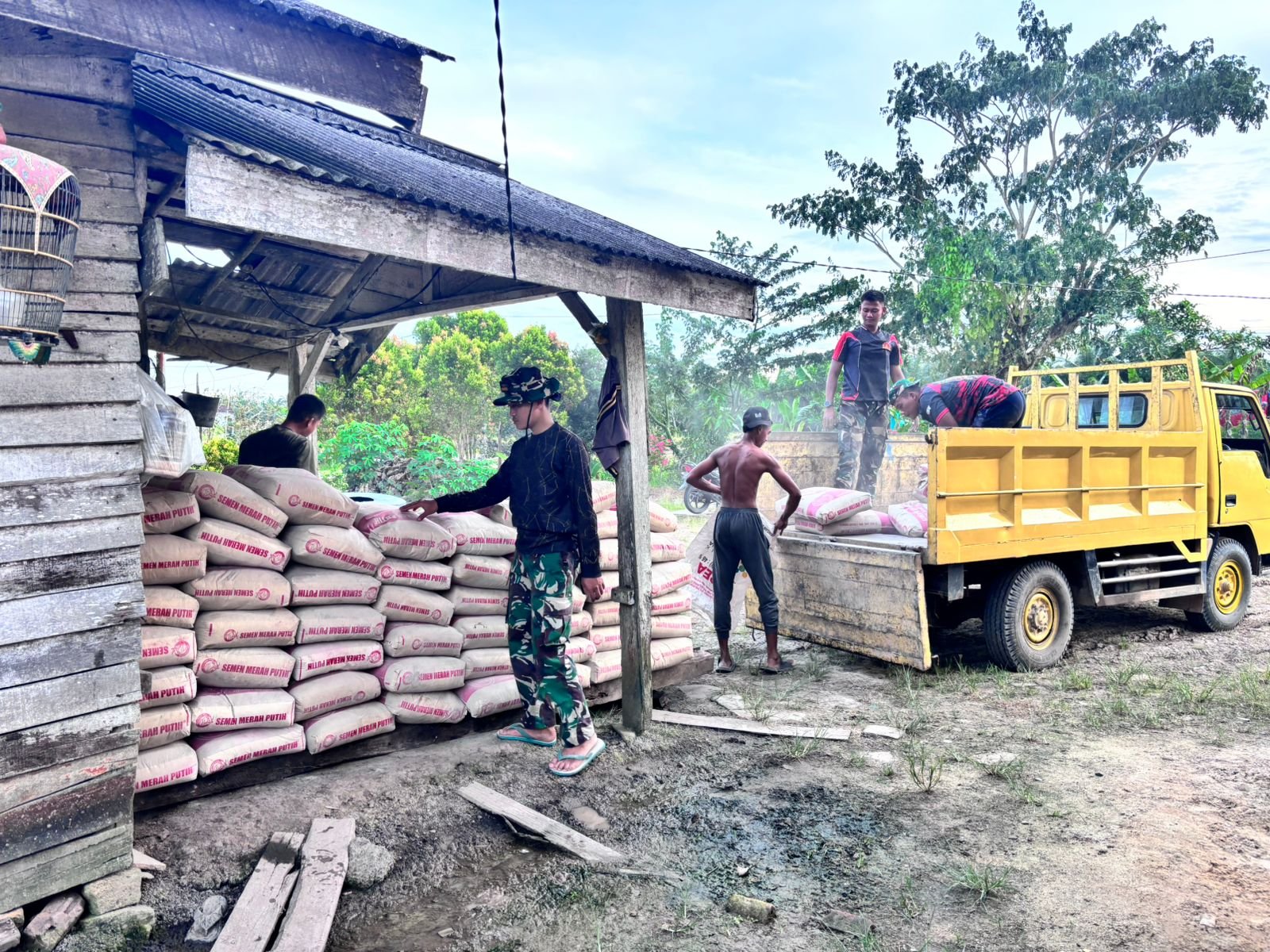 Aktivitas di Huntara Insitu Desa Gedumbak, Kecamatan Langkahan, menunjukkan kegembiraan warga saat bantuan dari BNPB diterima. Pada hari Sabtu, 18