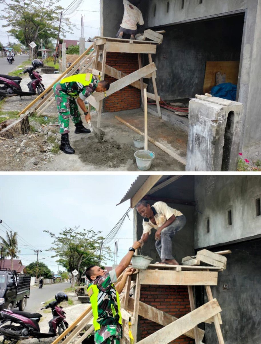 ACEH BARAT – Sertu Agustino, Babinsa Koramil 07/Johan Pahlawan, Kodim 0105/Aceh Barat, turut membantu warga membangun rumah di Desa Gampa,