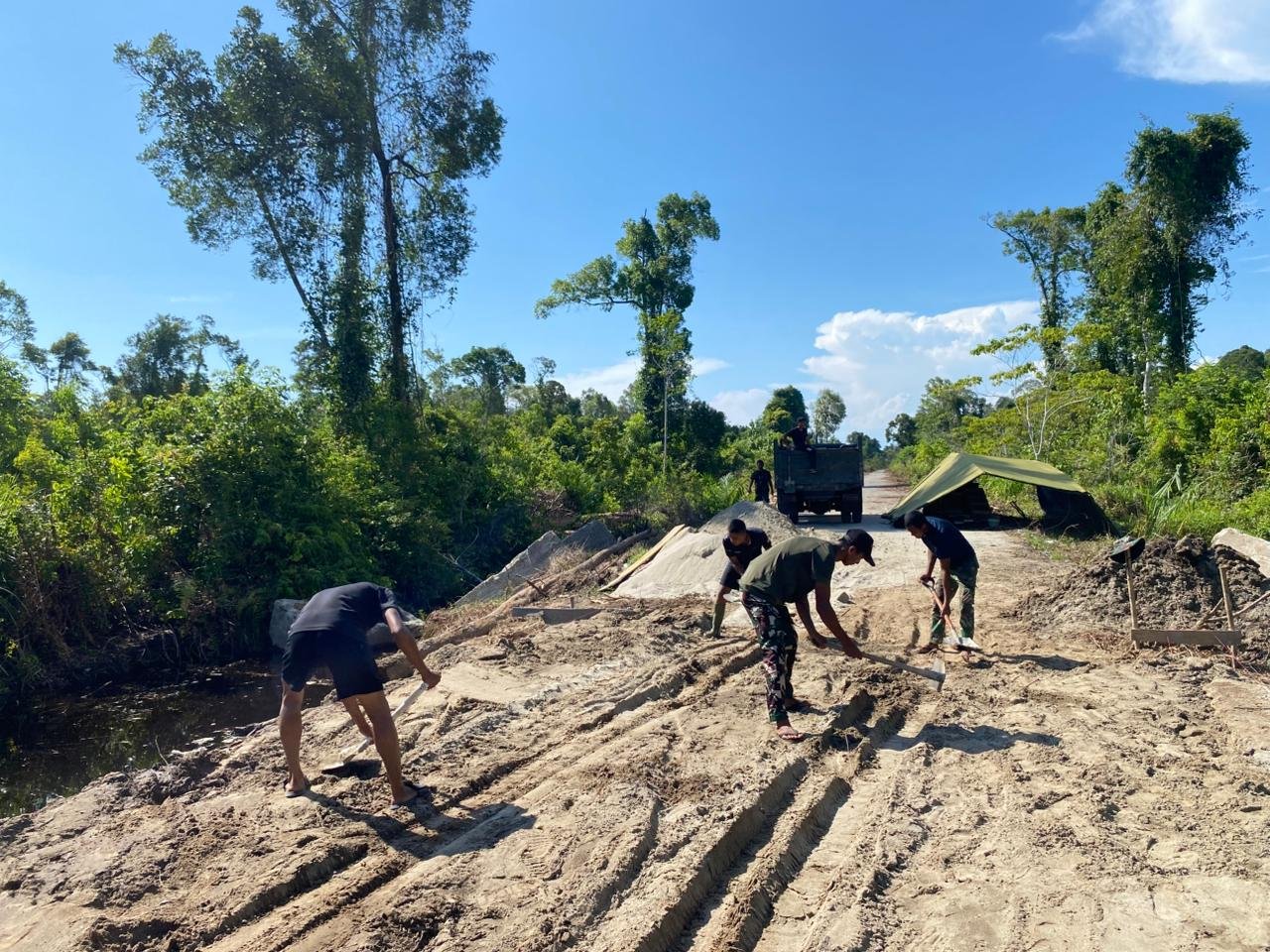 ACEH SELATAN – Personel TNI AD yang tergabung dalam Satgas pembangunan jembatan Aramco terus melanjutkan pekerjaan di titik Ketapang II