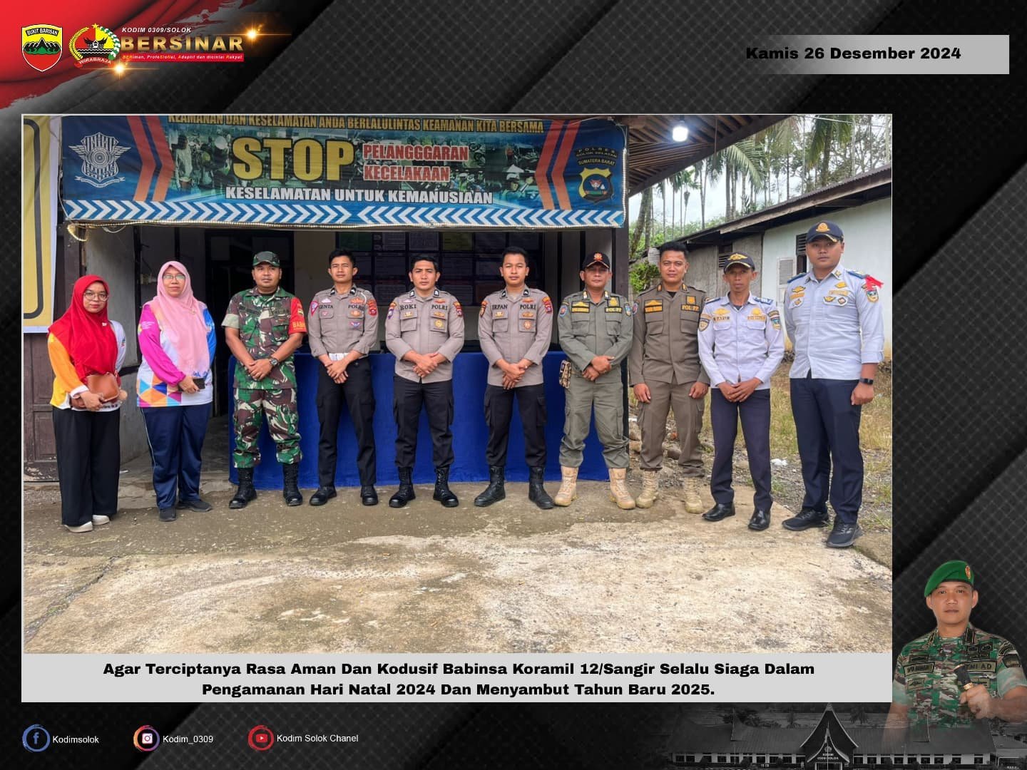 Babinsa Koramil 12/Sangir Kodim 0309/Solok Koptu Rudi Afrianto Selalu Siaga Dalam pengamanan Hari Natal 2024 Dan Menyambut Tahun Baru 2025 di Pos Pengamanan Nataru 2023 Lubuk Malako. Kamis (26/12/2024).