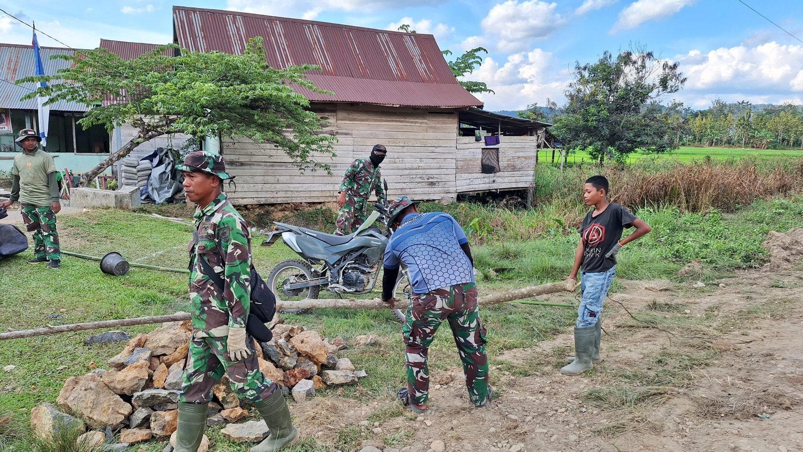 Tanpa ada komando atau paksaan, anak-anak itu datang dan bergabung dengan anggota Satgas TMMD 125 yang tengah bekerja. Meskipun masih usia belia, semangat mereka menunjukkan kepedulian terhadap lingkungan dan rasa kebersamaan yang tinggi.