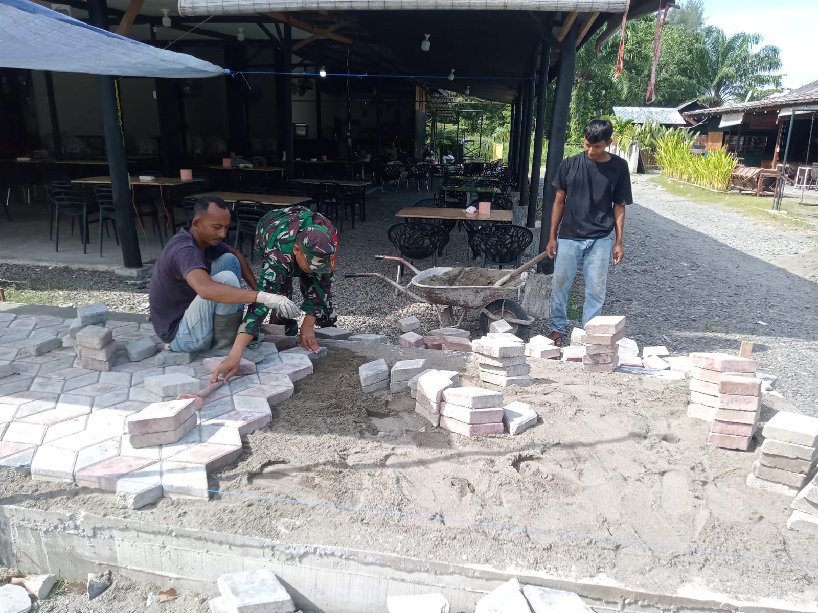 ACEH BARAT – Babinsa Koramil 07/ Johan Pahlawan, Kodim 0105/Aceh Barat, Sertu Eriska, membantu warga memasang paving blok di pinggir jalan Desa Kuta Padang, Senin (28-07-2025). Kegiatan ini menunjukkan kesediaan Sertu Eriska untuk membantu dan mendukung kegiatan masyarakat.