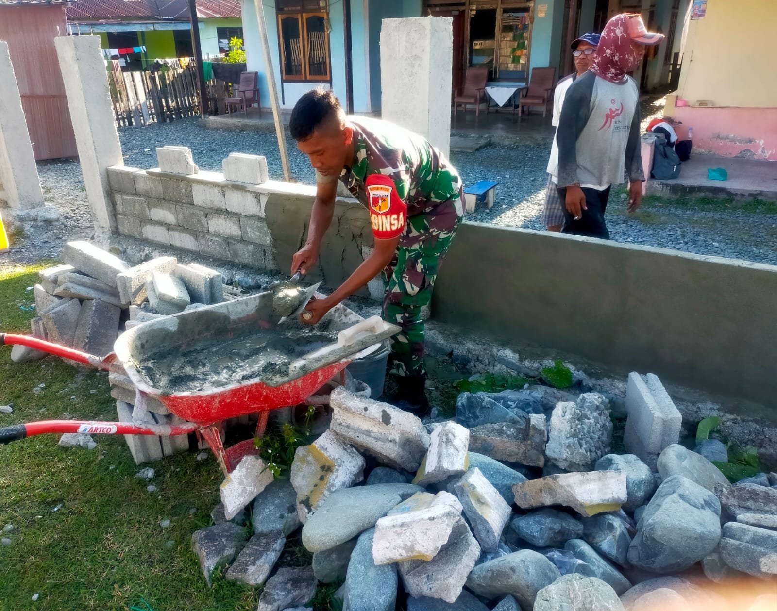 Anggota Koramil 1307-05/Ratolindo, Serda Yusran Laksanakan Komsos dan Bantu Pembuatan Pagar Rumah Warga