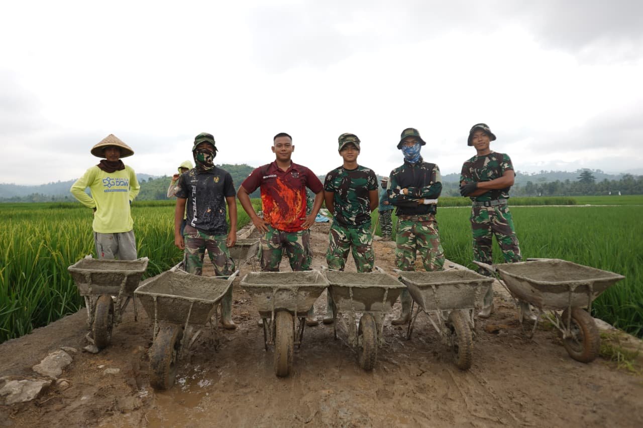 Partisipasi masyarakat terlihat jelas melalui keterlibatan aktif mereka dalam setiap fase pekerjaan. Anggota Tentara Nasional Indonesia dan warga bergotong royong meratakan serta memadatkan beton agar konstruksi yang dihasilkan kuat dan tahan lama.