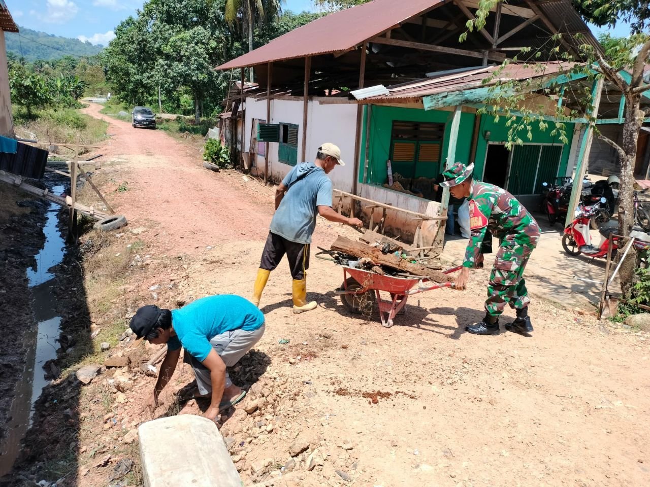 Antusias Babinsa dan Masyarakat Desa Amorome Dalam Membersihkan Saluran Air (Got) Yang Nampak Kotor.