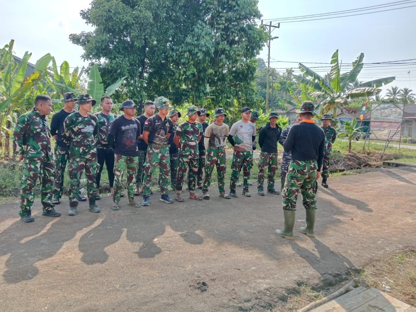 Apel pagi menjadi rutinitas penting sebelum para anggota Satgas melanjutkan pekerjaan pembangunan fisik di desa tersebut. Kegiatan apel kali ini dipimpin oleh Danramil 1207-07/Sungai Kakap, Kapten Inf. Gularto, yang menekankan pentingnya semangat kebersamaan dan gotong royong dalam setiap langkah kegiatan TMMD.