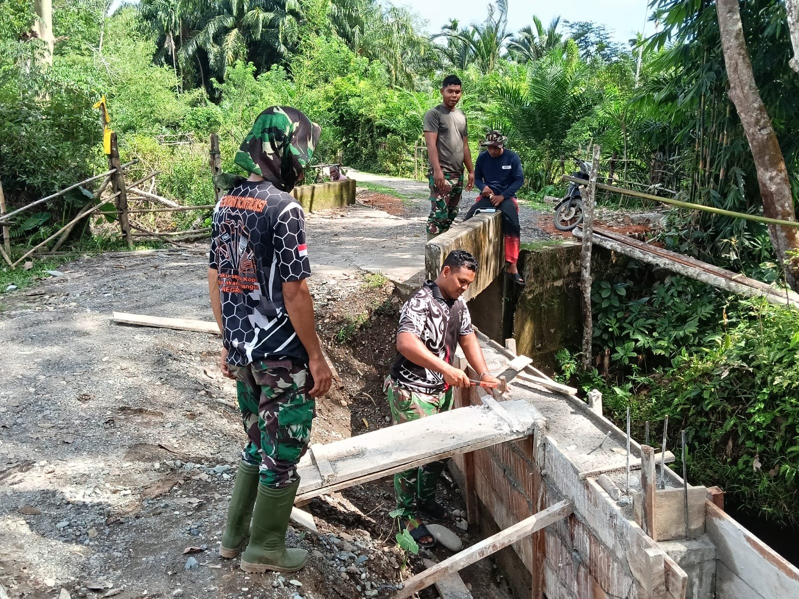 Aceh Barat – Di bawah langit Woyla, suara cangkul dan mesin molen menyatu dengan tawa kebersamaan. Satgas TMMD Reguler ke-127