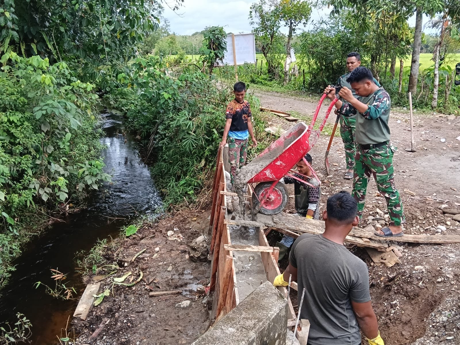 Aceh Barat – Di Desa Pasi Aceh, Kecamatan Woyla, semangat kebersamaan mengalir seperti sungai yang tak pernah surut. Satgas TMMD