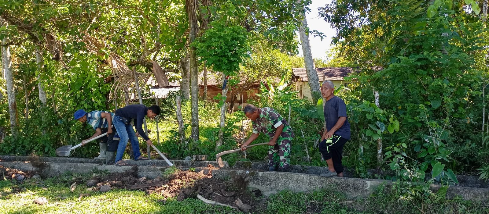 ACEH BARAT – Sertu Eko Saputra sebagai Babinsa Koramil 07/Johan Pahlawan, Kodim 0105/Aceh Barat, dalam terjun langsung membantu warga Desa