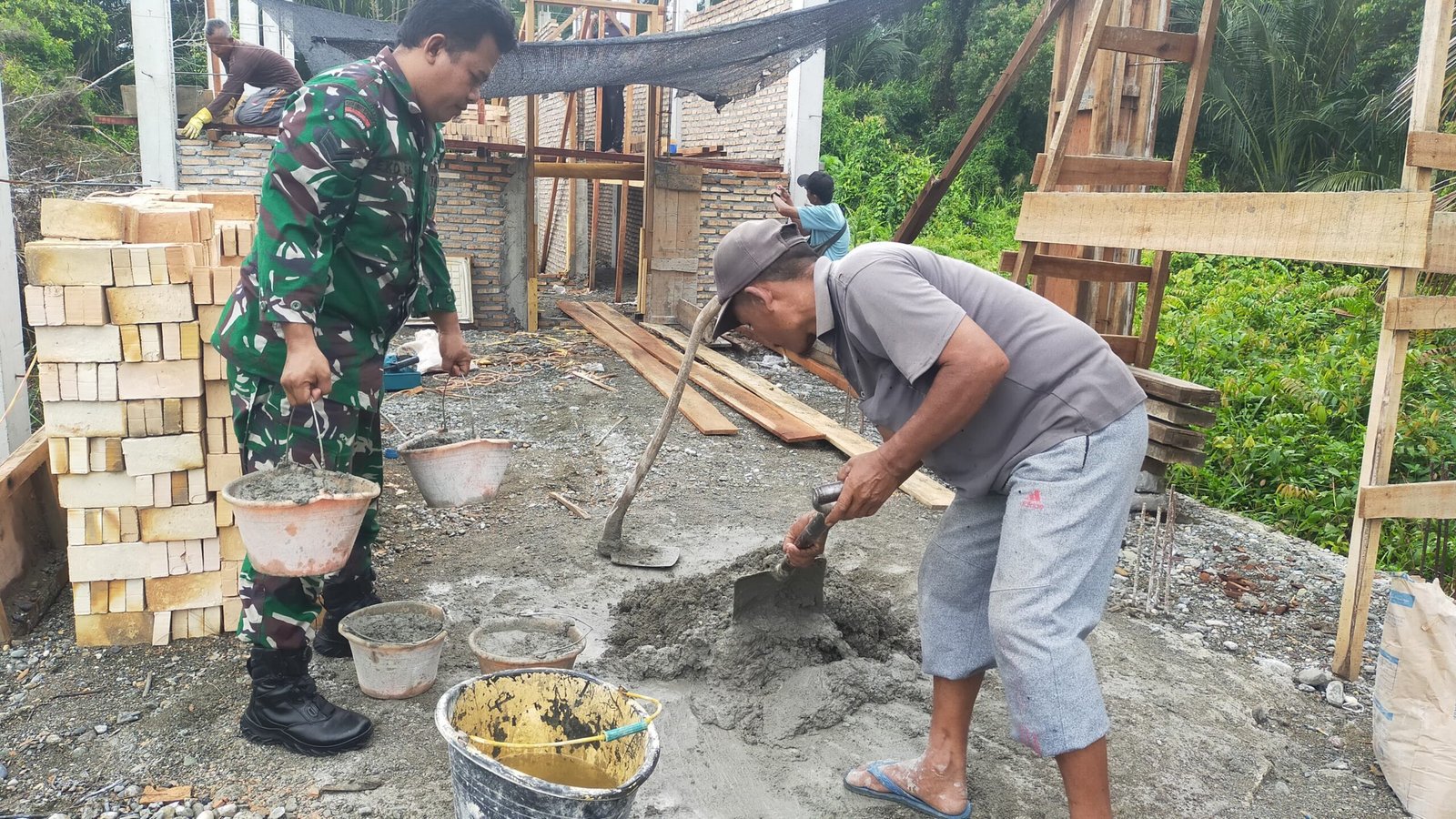 ACEH BARAT – Untuk menciptakan sinergitas TNI bersama rakyat, Babinsa Posramil 06/Bubon Kodim 0105/Aceh Barat membantu warga membangun rumah didesa