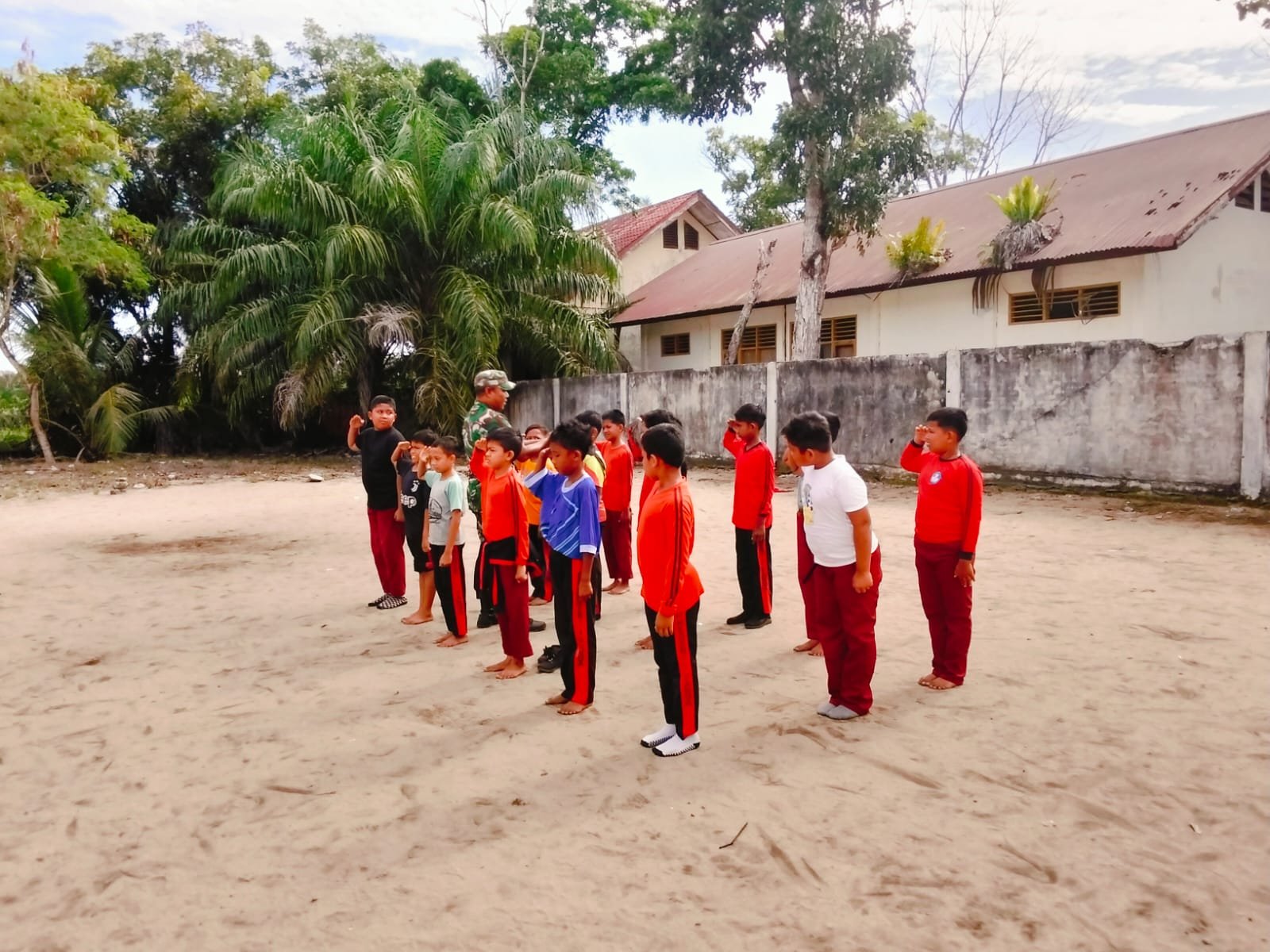 Aceh Jaya – Babinsa Koramil 0114-05/Panga Serda Astrada Beruh memberikan pelatihan Peraturan Baris Berbaris (PBB) kepada siswa-siswi SD Negeri 1