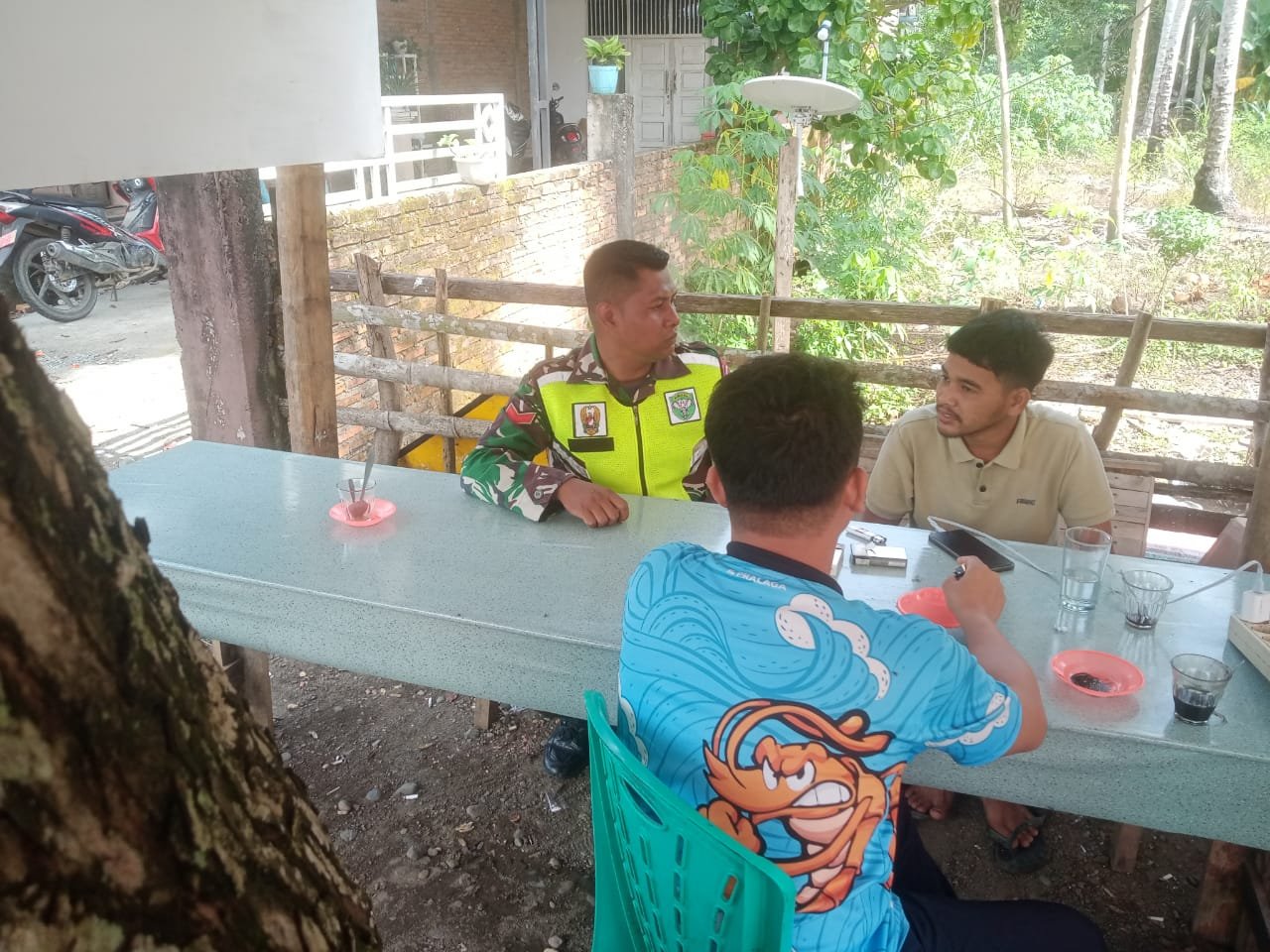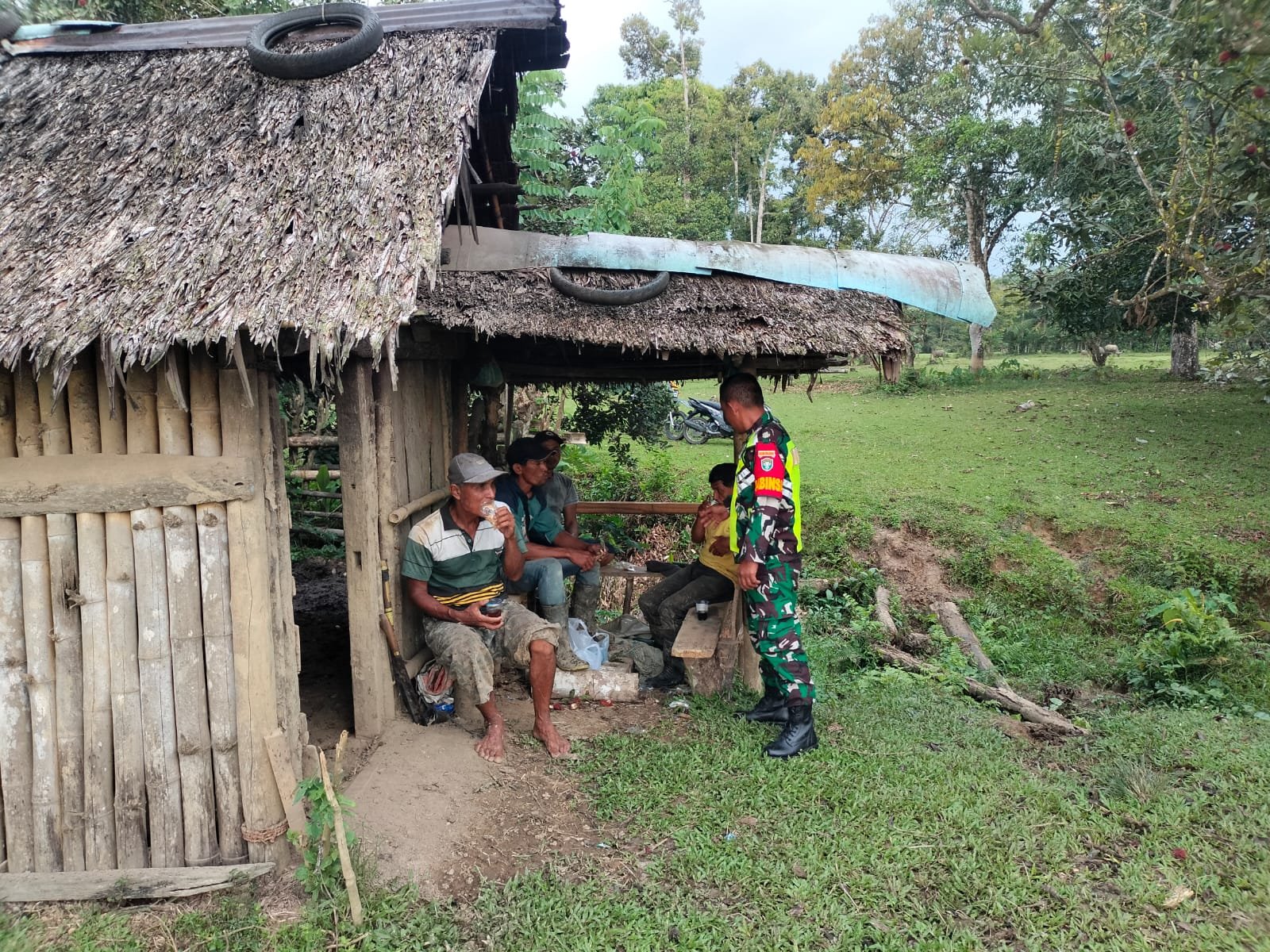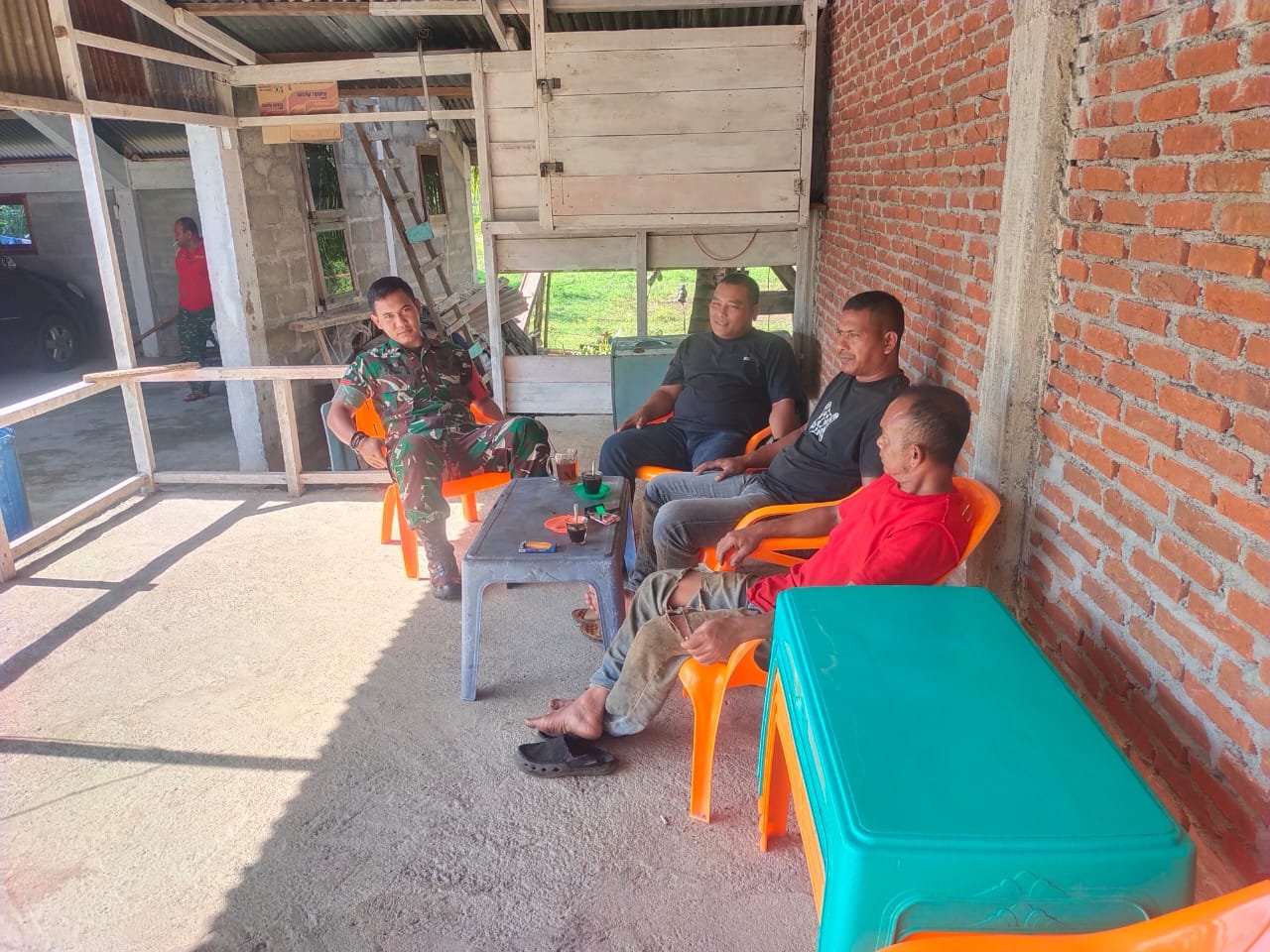 Aceh Jaya – Babinsa Koramil 0114-02/Sampoiniet Praka Tony melaksanakan Komunikasi Sosial (Komsos) dengan warga binaan dan pantau kondisi diwilayah binaan
