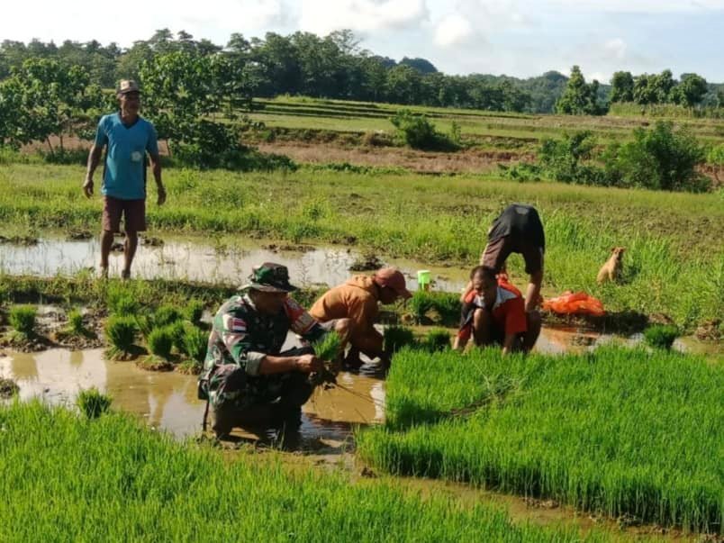 SUMBA BARAT – Babinsa Sertu Juakim Dacosta dari Koramil 01/Loli Kodim 1613/Sumba Barat, membantu warga desa binaannya cabut bibit padi di Desa Bina Mora, Kecamatan Loli, Kabupaten Sumba Barat, Kamis (09/01/2025).