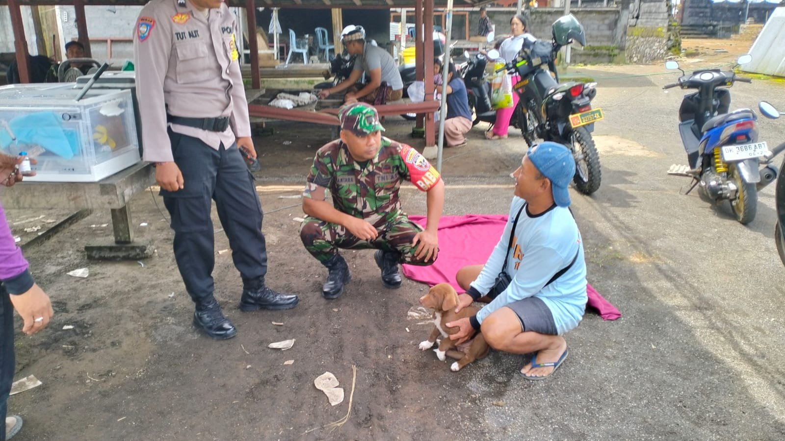 Bangli – Dalam rangka mendukung Pelayanan Jasa Medik Veteriner berupa sterilisasi dan vaksinasi rabies untuk anjing dan kucing, Babinsa Desa Landih, Koramil 01/Bangli, Kodim 1626/Bangli, Serma I Komang Juni Suantara bersama Bhabinkamtibmas Desa Landih melaksanakan pemantauan dan pendampingan kegiatan tersebut yang bertempat di Jaba Pura Puseh Bale Agung, Desa Adat Palaktiying, Desa Landih, Kecamatan/Kabupaten Bangli. Jumat (17/01/25).