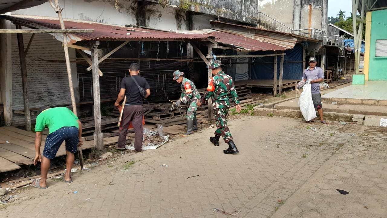 Babinsa dan masyarakat saling bahu membahu membersihkan pasar tradisional di Lambudoni