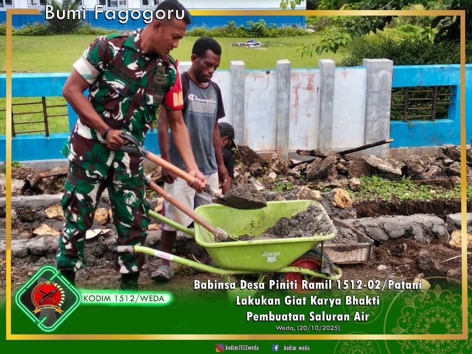Halmahera Tengah-Babinsa Desa Piniti Serda Laode Faimi melaksanakan Giat Karbak membantu Masyarakat membuat Saluran Air,di Desa Piniti,Kecamatan Patani Timur,Kabupaten Halmahera Tengah.Senin, (20/10/2025)