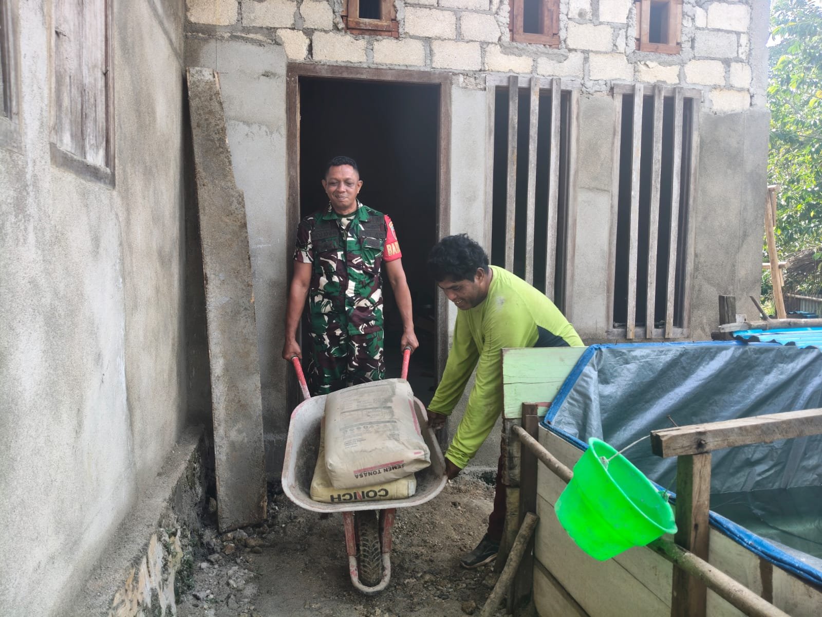 Halmahera Tengah – Sertu M. Guntur Risahondua, Babinsa Desa Umiyal dari Koramil 1512-03/Gebe, menunjukkan komitmennya dalam mendukung masyarakat melalui kegiatan kerja bakti. Pada Selasa, 6 Januari 2026, ia terlibat langsung dalam proses pencampuran semen dan pasir untuk plesteran dinding rumah warga bernama Bandar Marica. Kegiatan ini berlangsung di Desa Umiyal, Kecamatan Pulau Gebe, Kabupaten Halmahera Tengah.