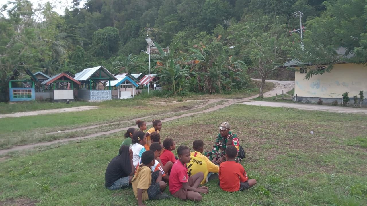 Dalam waktu jeda tersebut, Sertu Daniel Ndiken, Babinsa Kampung Marsi, tampak duduk bersama anak-anak lokal yang mendekati area kegiatan. Suasana yang hangat dan akrab membuat anak-anak merasa nyaman dalam berinteraksi dengan prajurit TNI tersebut.