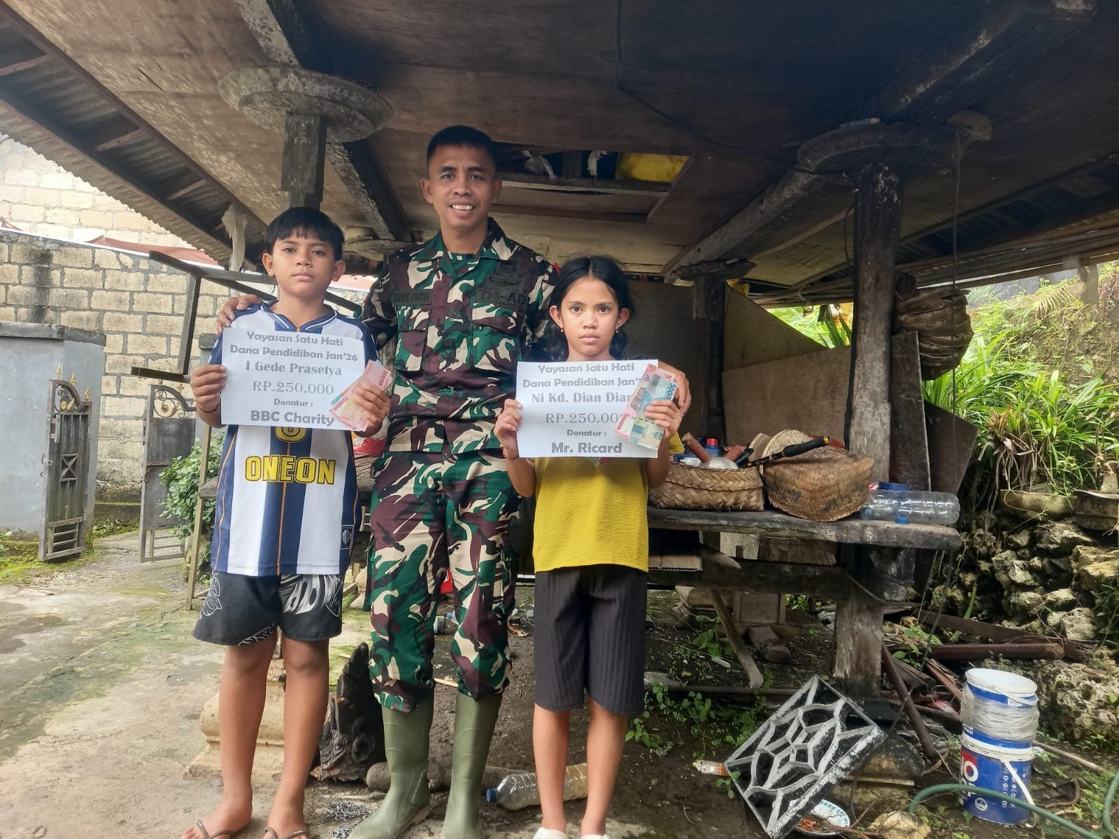 Kedua anak asuh tersebut tampak bersemangat menerima bantuan ini. Gede mengungkapkan, “Terima kasih kepada Yayasan Satu Hati atas dukungan yang telah diberikan dan kepada pak Babinsa atas perhatian yang penuh kasih ini.”