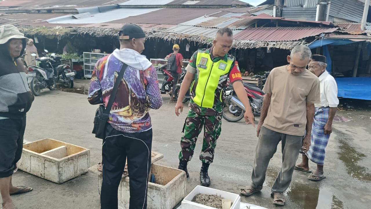 ACEH BARAT – Babinsa Koramil 08/Arongan Lambalek Kodim 0105/Abar, Koptu Adi Diarto, melaksanakan kegiatan komunikasi sosial (komsos) dengan masyarakat sambil memantau harga bahan kebutuhan pokok (ikan) di pasar tradisional Desa Teupin Peuraho, Kecamatan Arongan Lambalek, Kabupaten Aceh Barat, Kamis (03/07/2025).