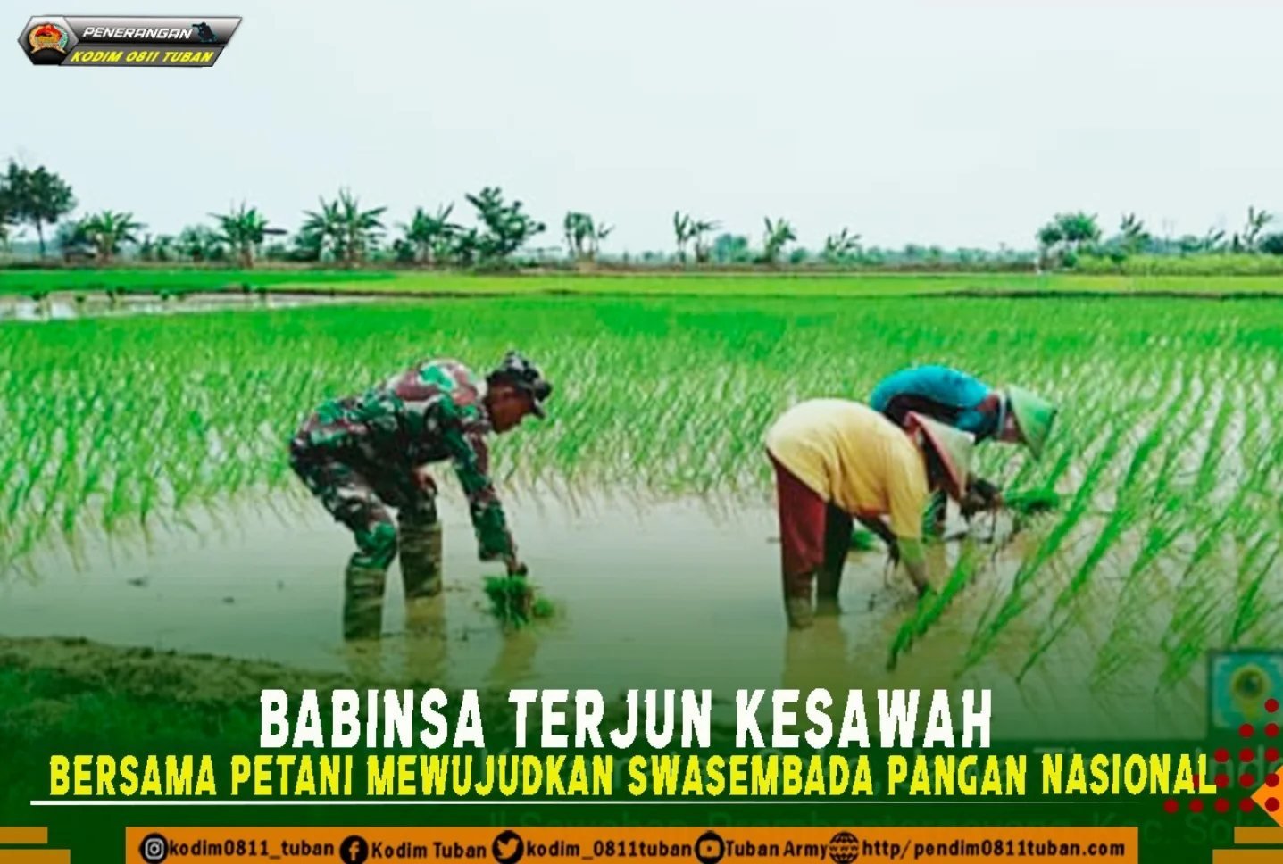 Sertu Kasminto Babinsa Koramil 0811/05 Rengel menerangkan bahwa kegiatan pendampingan membantu petani dalam proses penanaman padi seluas 1,5 hektar di lahan milik Bpk. Muhammad Sholikin.