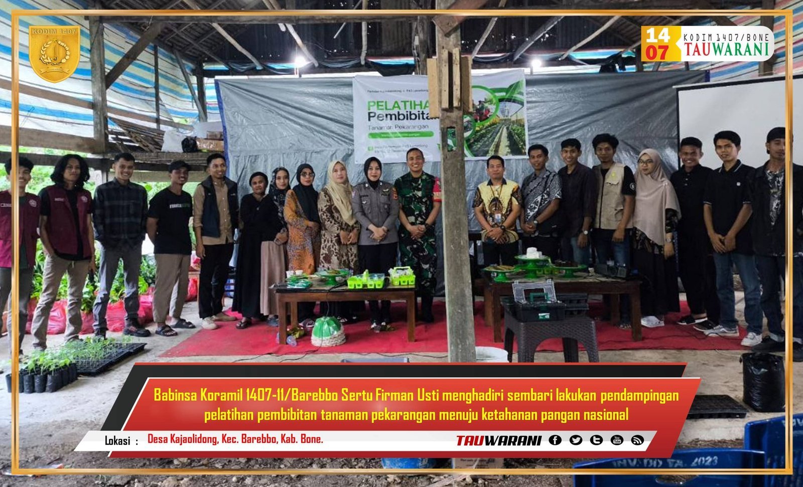 Bone – Dalam rangka mendukung program ketahanan pangan nasional, Babinsa Koramil 1407-11/Barebbo, Sertu Firman Usti, menghadiri sekaligus mendampingi pelatihan pembibitan tanaman pekarangan yang dilaksanakan di Aula Pertemuan P4S Lamellong, Desa Kajaolidong, Kecamatan Barebbo, Kabupaten Bone, pada Selasa (19/12/2024).