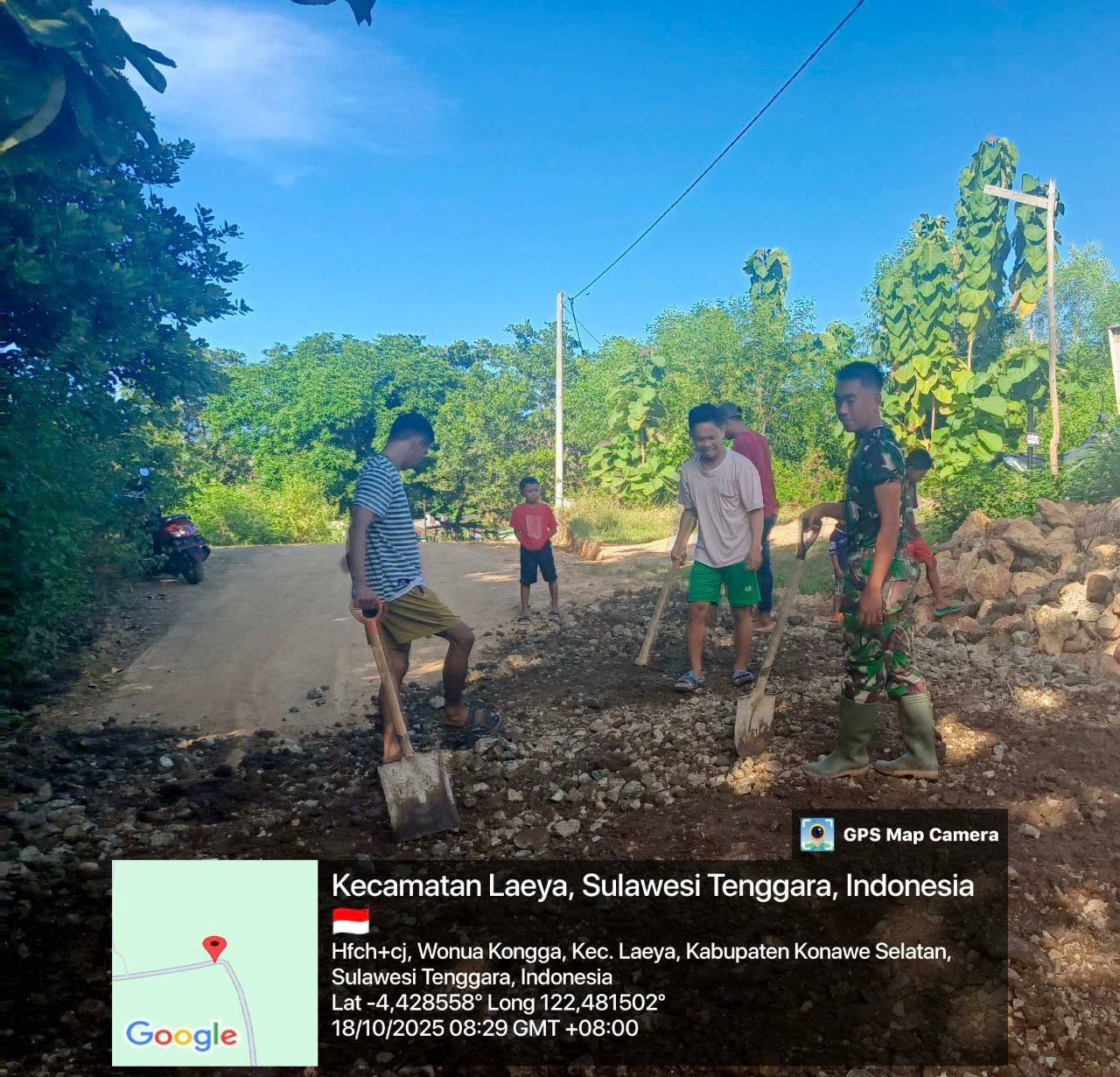 Konawe Selatan — Bentuk kepedulian terhadap keselamatan dan kenyamanan warga kembali diperlihatkan oleh Babinsa Koramil 1417-04/Lainea Kodim 1417/Kendari, Kopda Asrul Abasse. Pada Sabtu (18/10), ia melaksanakan kerja bakti bersama warga untuk menimbun jalan rusak di depan rumah salah satu warga binaannya di Desa Wonua Kongga, Kecamatan Laeya.