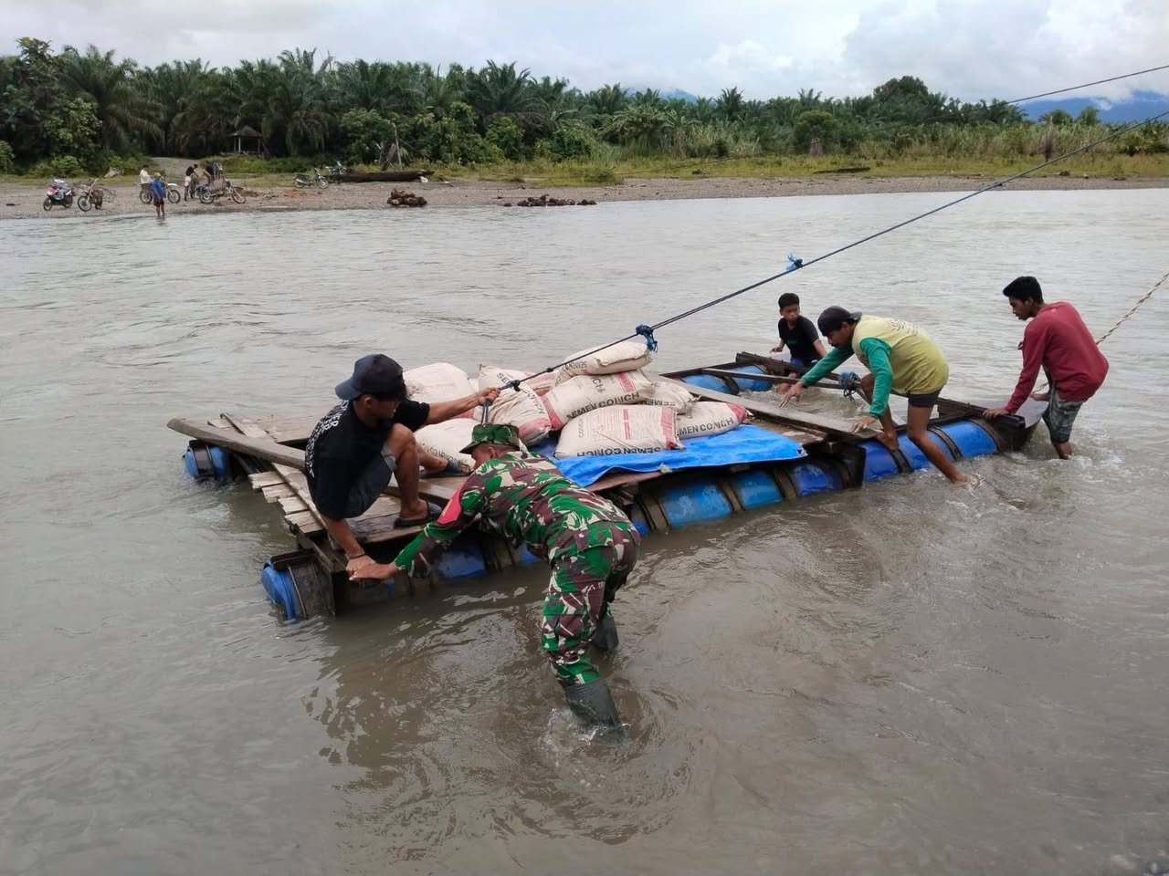 PASANGKAYU, Babinsa Koramil 1427-03 Baras, Serda Budiman, melaksanakan kegiatan pengantaran semen ke lokasi TMMD di Dusun Kanan Tuo, Desa Benggaulu, Kecamatan Dapurang, Kabupaten Pasangkayu pada hari Rabu, 27 Januari 2025.