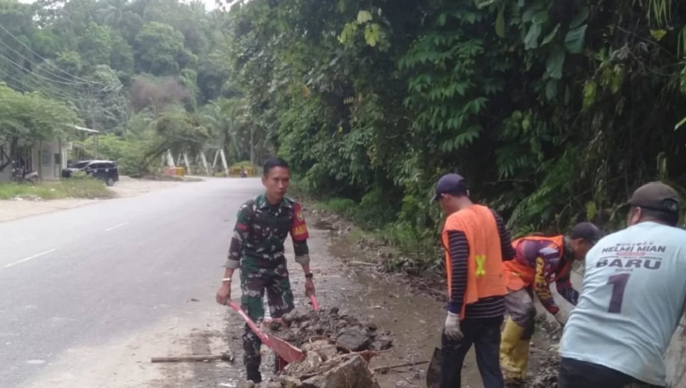 Babinsa Koramil 408-02/KU Bersama Warga Bersihkan Material Tanah Longsor