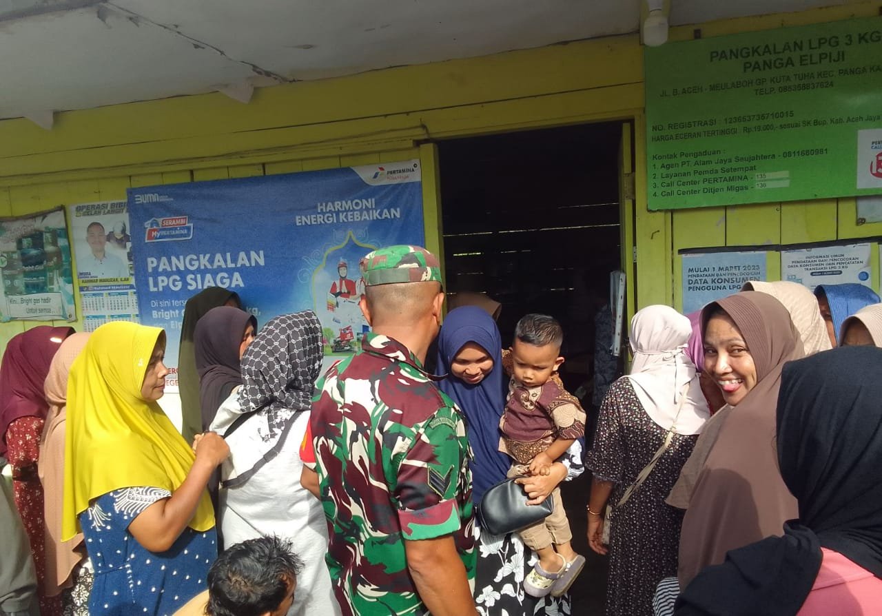 ACEH JAYA – Babinsa Koramil 05/Panga Kodim 0114/Aceh Jaya, Serka Faisal, melaksanakan pengamanan pendistribusian tabung gas LPG 3 kilogram di pangkalan milik Sdr. Ismail yang berlokasi di Desa Kuta Tuha, Kecamatan Panga, Kabupaten Aceh Jaya, Minggu (21/12/2025).