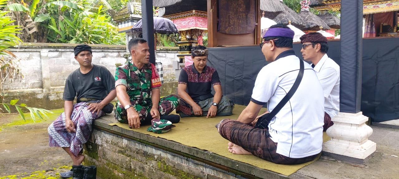 Babinsa Ngaturang Atos Sekaligus Komsos Agar Persiapan Piodalan Tumpek Wayang di Pura Puseh Babaan Berjalan Lancar