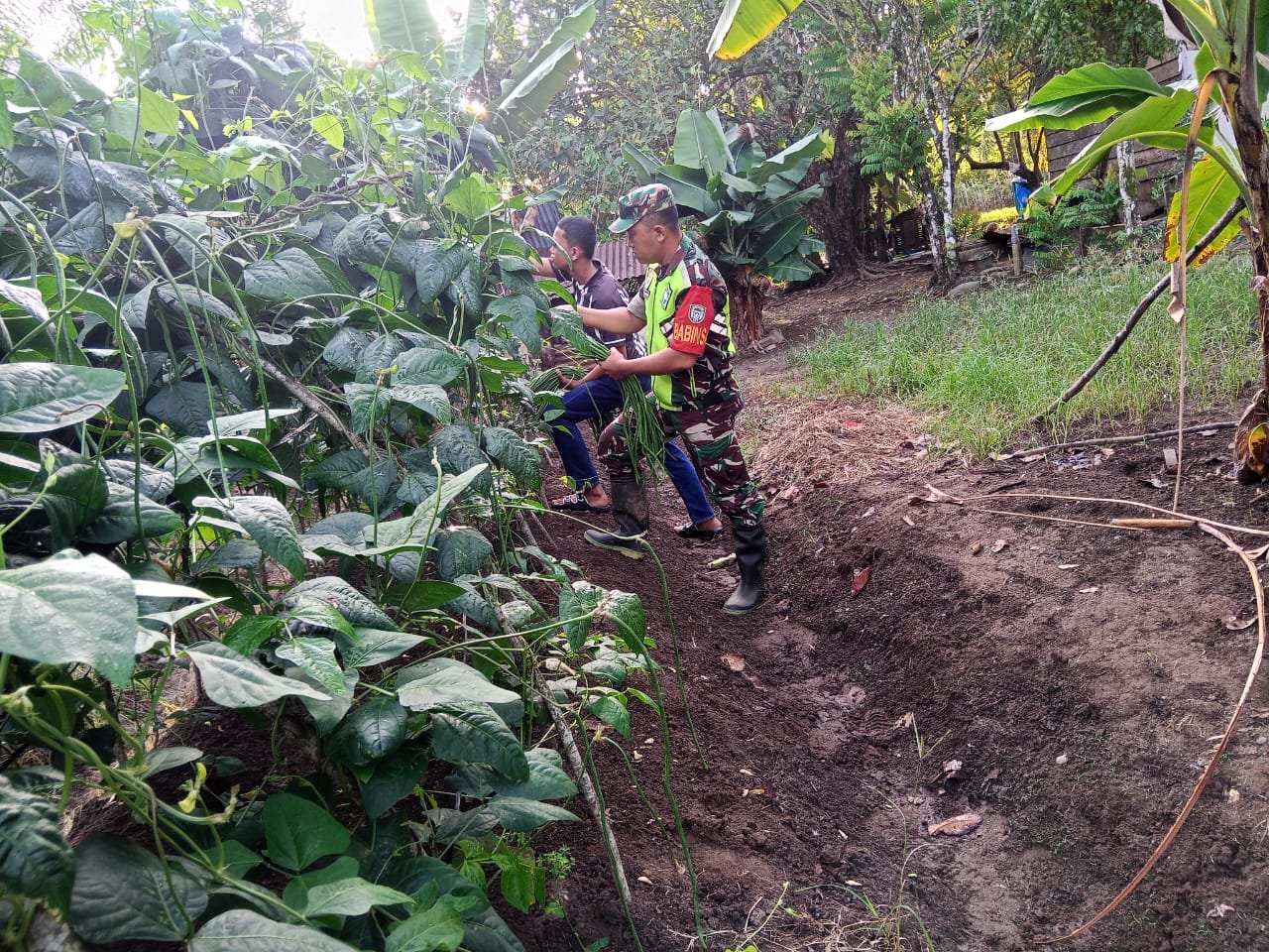 Dengan semangat, Babinsa bersama warga binaan bahu-membahu memanen kacang panjang yang telah siap panen.