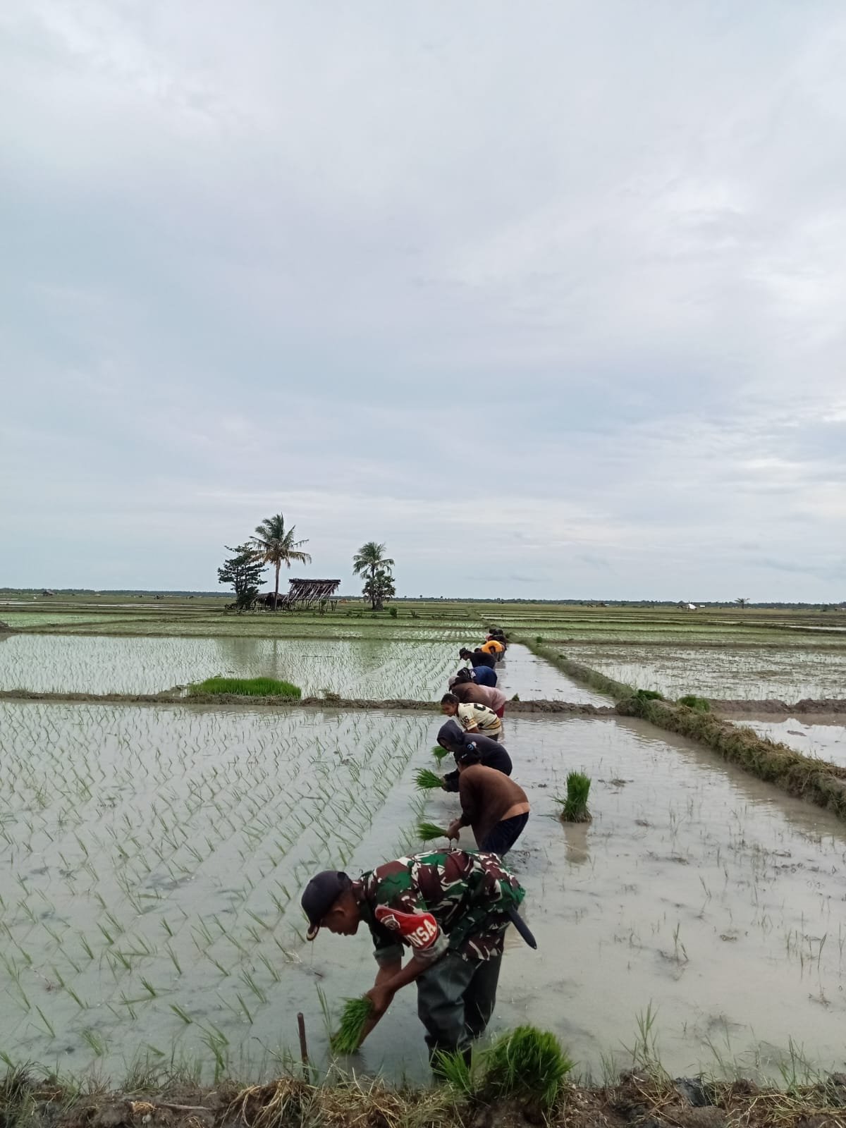 Dalam kesempatan ini, Babinsa tidak hanya melakukan pemantauan situasi wilayah, tetapi juga ikut serta langsung dalam proses penanaman padi di area persawahan Rata Bena. Kehadiran Babinsa disambut antusias oleh petani yang memanfaatkan musim tanam.