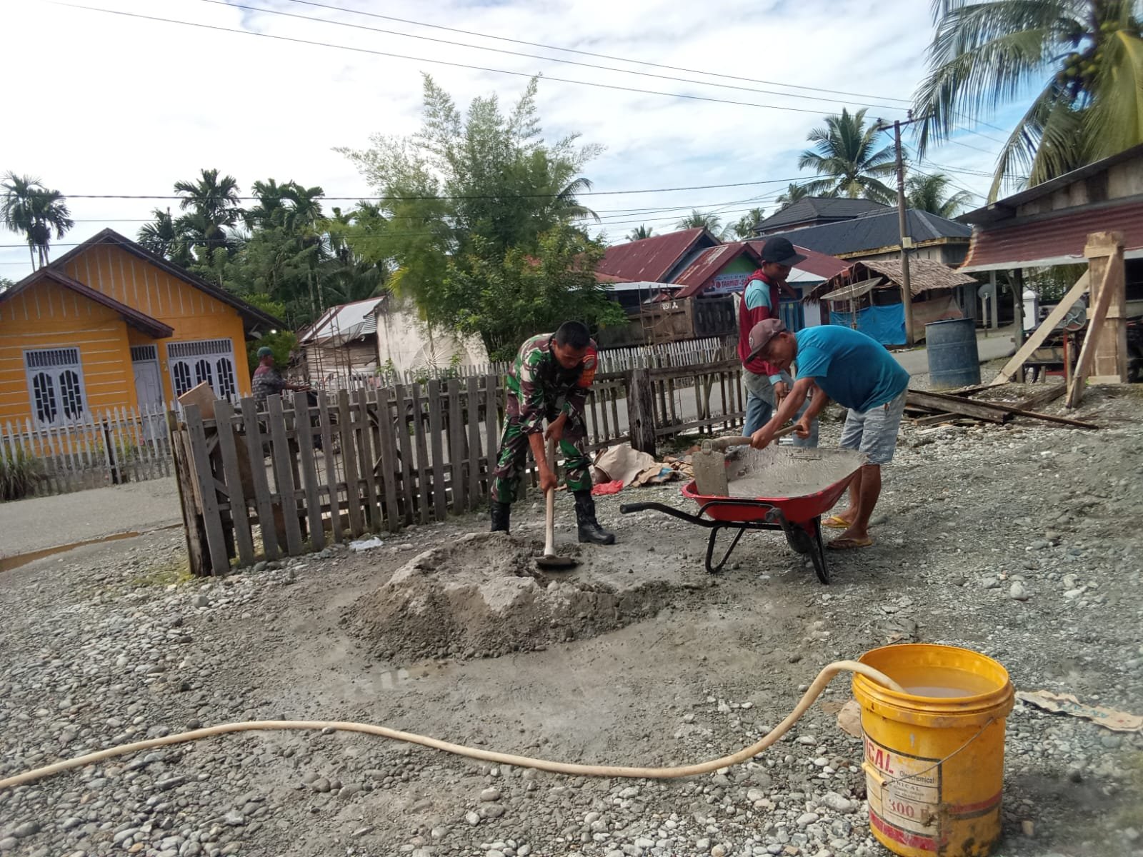 ACEH BARAT – Babinsa Posramil 05/Pante Ceureumen Kodim 0105/Aceh Barat, Sertu Modini, terus menunjukkan kepeduliannya terhadap warga binaan dengan turut membantu proses pembangunan tiang rumah milik salah satu warga di Desa Lhok Sari, Kecamatan Pante Ceureumen, Kabupaten Aceh Barat, Sabtu (8/11/2025).