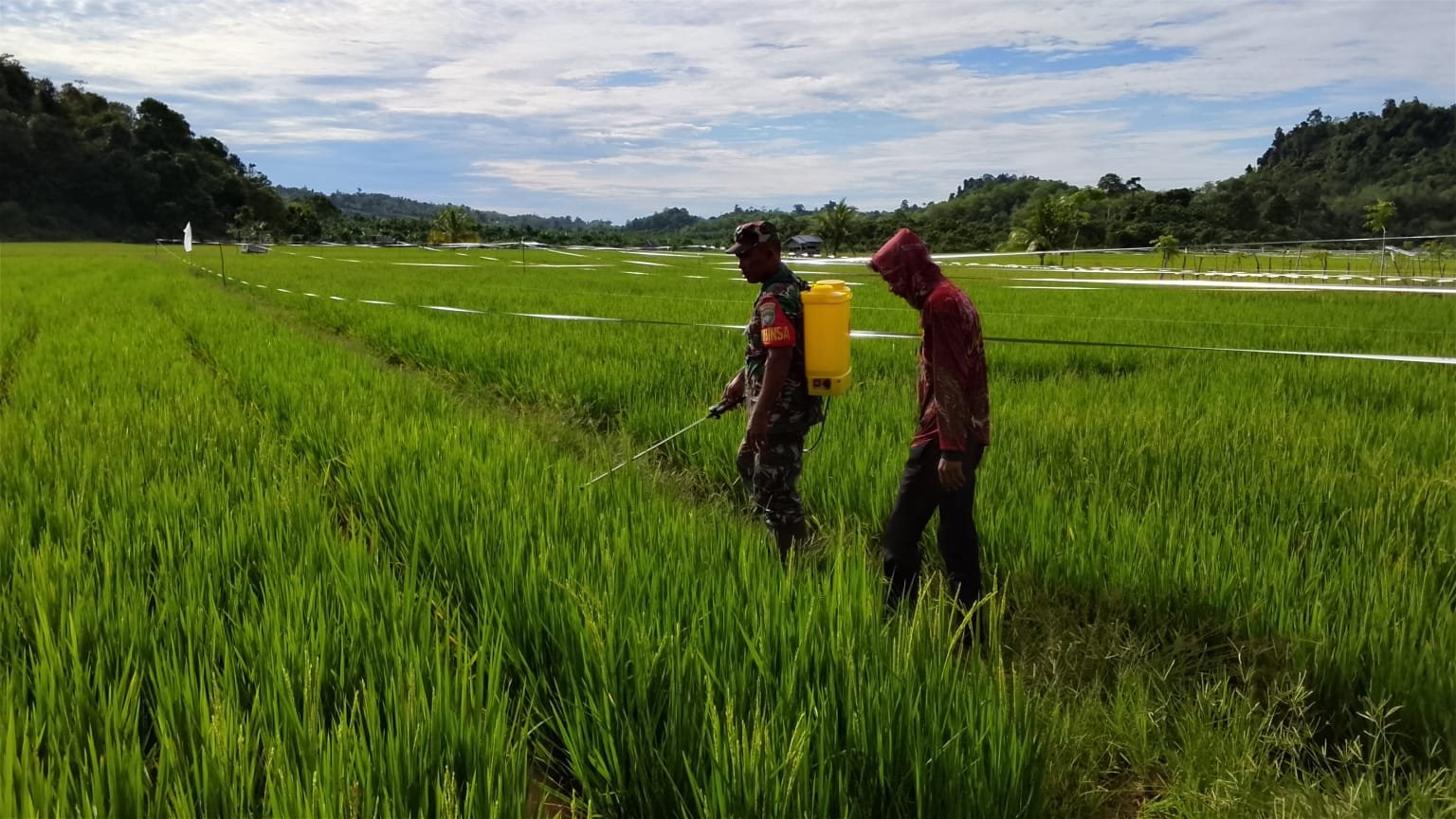 Dalam kegiatan tersebut, Sertu M. Hasan turut membantu para petani yang tergabung dalam Kelompok Tani (Poktan) Udep Bersama melakukan penyemprotan insektisida pada tanaman padi guna mencegah serangan hama walang sangit yang mulai menyerang tanaman padi yang sedang memasuki fase berbuah.