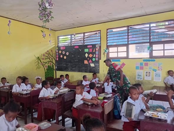 Babinsa Serui Awasi Program Makan Bergizi Gratis di Angkaisera untuk Anak Sekolah