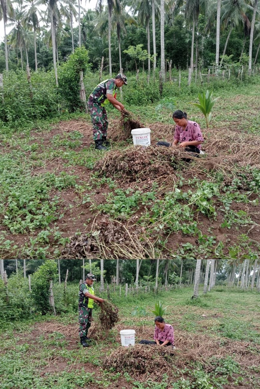 Babinsa Woyla Barat Dorong Ketahanan Pangan, Bantu Warga Panen Kacang Tanah di Sela Pohon Kelapa