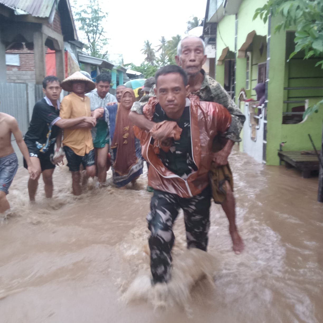 Terlihat Danramil dan anggota Babinsa juga turut membopong serta menggendong lansia secara manual untuk dievakuasi ke tempat yang lebih aman.