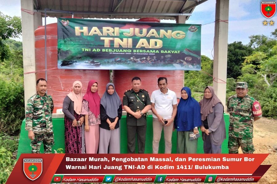 Bulukumba – Dalam rangka memperingati Hari Juang TNI-AD, Kodim 1411/Bulukumba menyelenggarakan serangkaian kegiatan sosial yang meliputi bazaar murah, pengobatan massal, serta peresmian sumur bor manunggal air di Desa Darubiah, Kecamatan Bontobahari, Kabupaten Bulukumba, Minggu (15-12-2024).