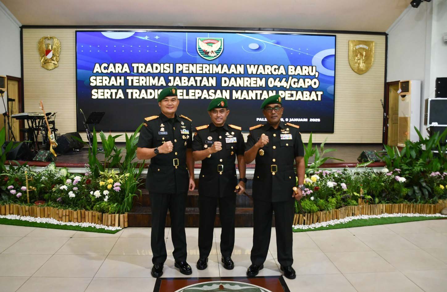 Palembang – Prosesi serah terima jabatan Komandan Korem 044/Garuda Dempo dari Brigjen TNI Muhammad Thohir kepada Brigjen TNI Adri Koesdyanto dipimpin secara langsung oleh Pangdam II/Swj Mayjen TNI M. Naudi Nurdika, bertempat di Gedung Sudirman Makodam II/Swj Jl. Jenderal Sudirman Km. 2,5 Kota Palembang, Jumat (10/1/2025).