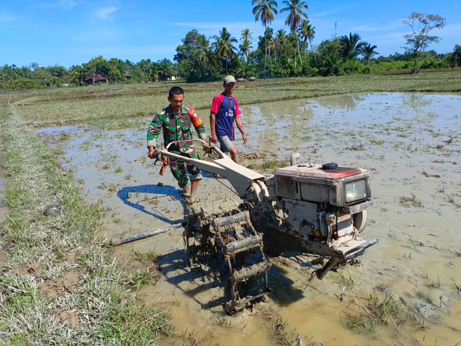 ACEH BARAT – Babinsa Koramil 09/Samatiga, Sertu Buchari Muslim, melaksanakan kegiatan pendampingan kepada kelompok tani (Pok Tani) dalam membajak sawah
