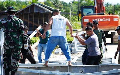 ACEH SINGKIL – Prajurit Kodim 0109/Aceh Singkil bersama Prajurit Batalyon Zipur 16/DA dan masyarakat bahu-membahu dalam pengerjaan Jembatan Bailey yang berada