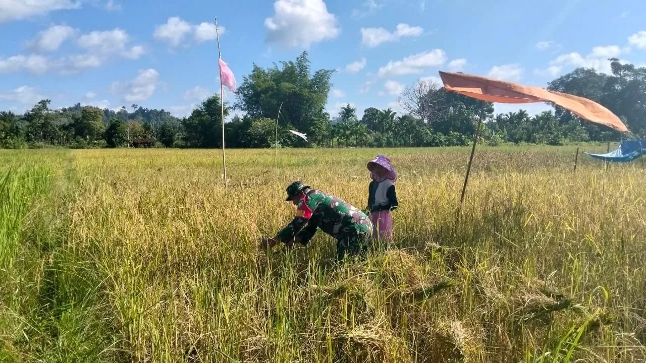 Simeulue – Babinsa Koramil 04/Salang Kodim 0115/Simeulue Korem 012/Teuku Umar, Kopka Subana, melaksanakan kegiatan pendampingan sekaligus panen padi bersama warga