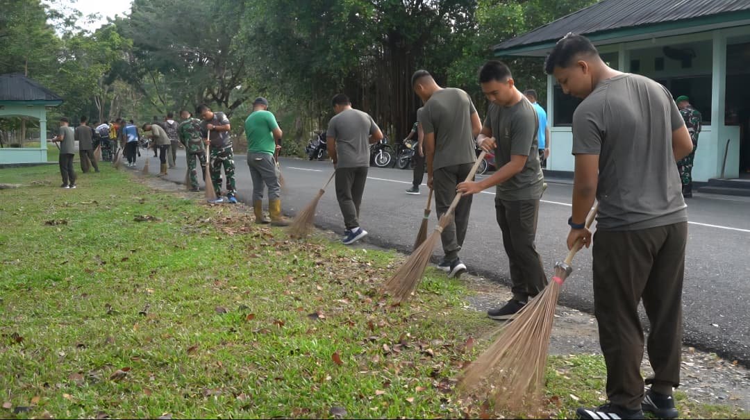 Meulaboh – Dalam rangka menjaga kebersihan dan kerapian lingkungan satuan, Korem 012/Teuku Umar melaksanakan kegiatan Jum’at Bersih dengan melaksanakan pembersihan