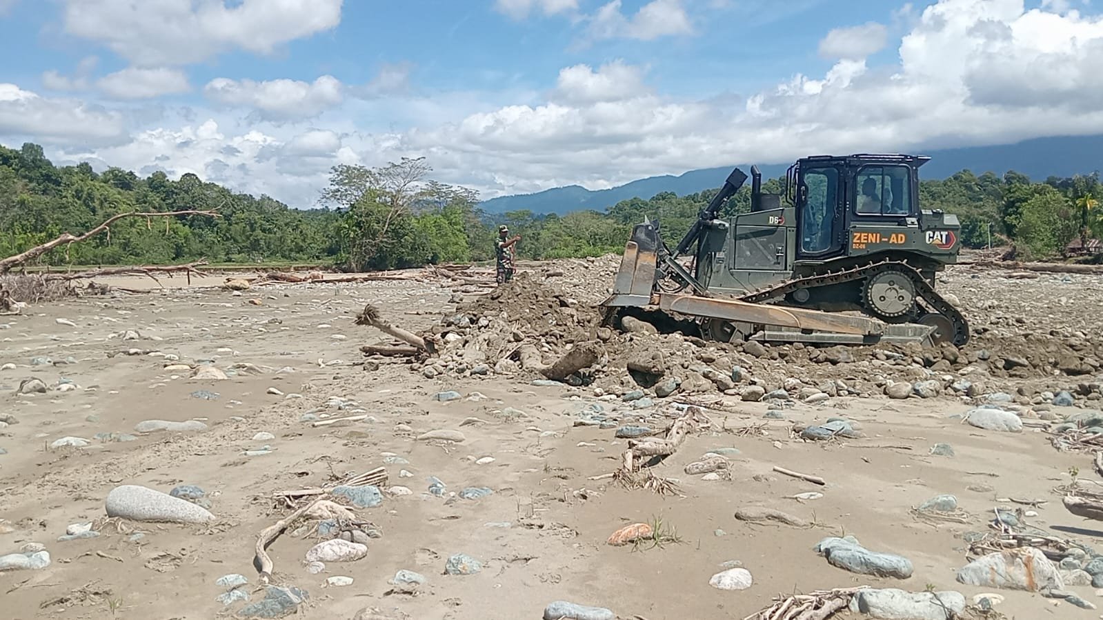 Aceh Barat – Pascabencana banjir yang melanda sungai yang melintasi Desa Jambak–Sikundo, Kecamatan Pante Ceureumen, prajurit Kodim 0105/Abar terus bergerak