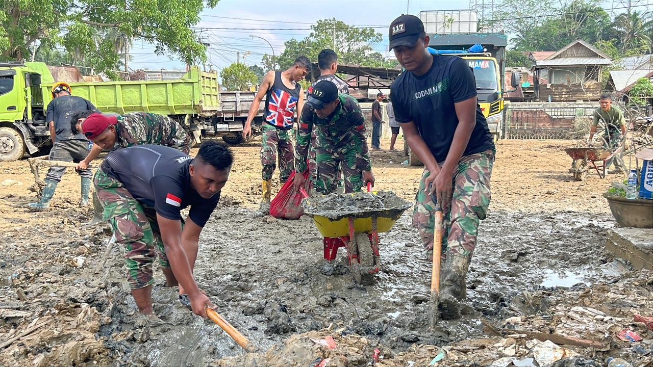 Pasca terjadinya bencana banjir, TNI bersama relawan terus bergerak cepat melaksanakan pembersihan sejumlah fasilitas umum yang terdampak. Kegiatan ini dilakukan