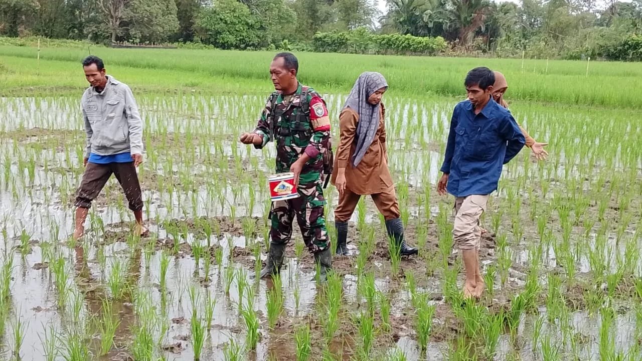 Aceh Barat Daya – Babinsa Koramil 04/Susoh Kodim 0110/Abdya, Serka Joni Warman, mendampingi keujrun tani meninjau perkembangan tanaman padi yang
