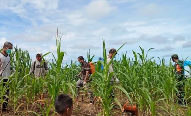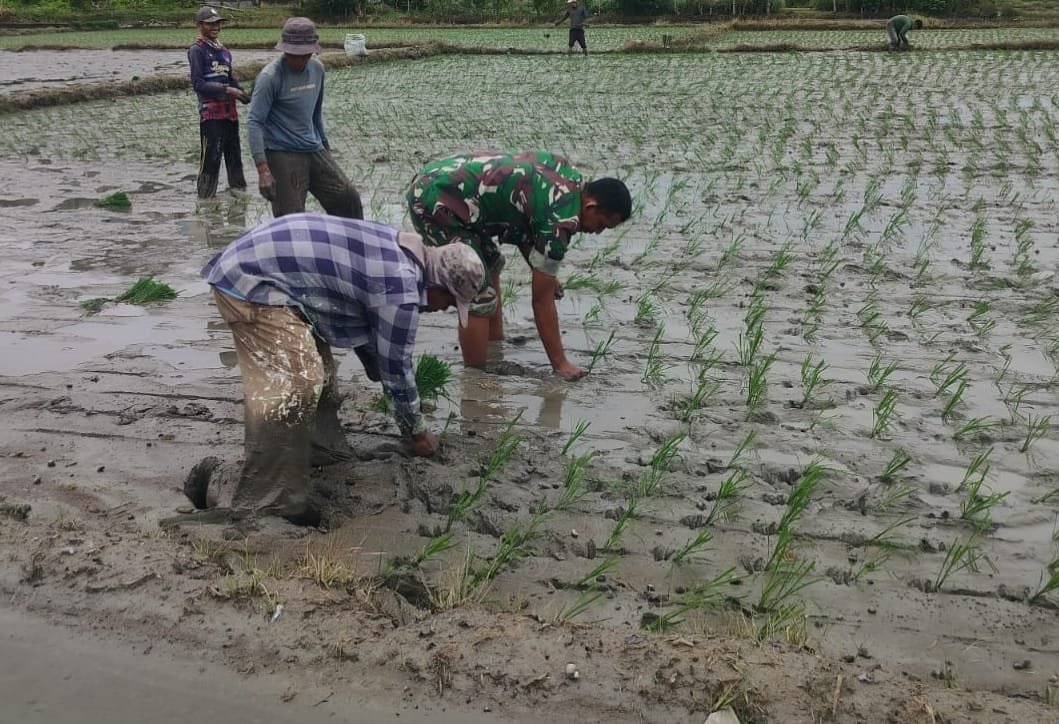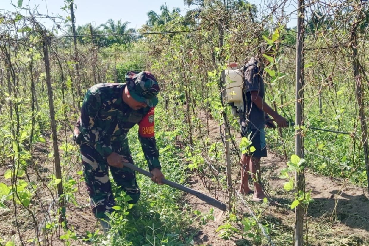 ACEH JAYA – Babinsa Posramil Pasie Raya Kodim 0114/Aceh Jaya, Sertu Syamsul, melaksanakan karya bakti membantu warga dalam pembangunan balai