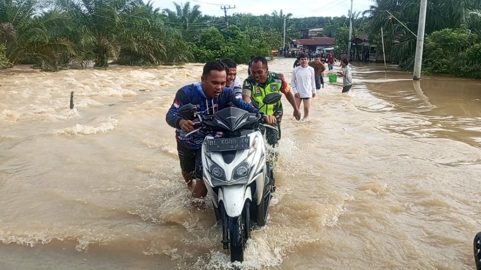 SULTAN DAULAT – Guyuran hujan deras sejak dini hari membuat Sungai Rikit meluap dan merendam ruas Jalan Nasional Subulussalam–Tapaktuan di